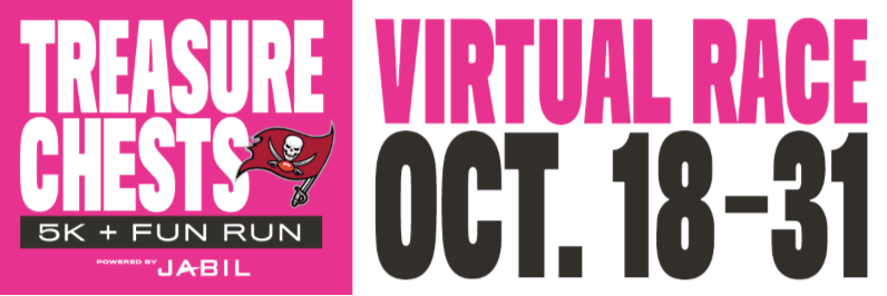 This fall, the Buccaneers' Treasure Chests 5K + Fun Run, powered by Jabil, will take place virtually. This virtual event will continue to benefit local organizations in Tampa Bay who specializes in breast cancer research and patient services. We hope you can join us October 18-31 by running anytime in the United States, anywhere! Whether it’s at home on your treadmill, in the park at the break of dawn, or a stroll around your neighborhood after lunch, you can complete the 2020 Treasure Chests 5K + Fun Powered by Jabil on your terms.
