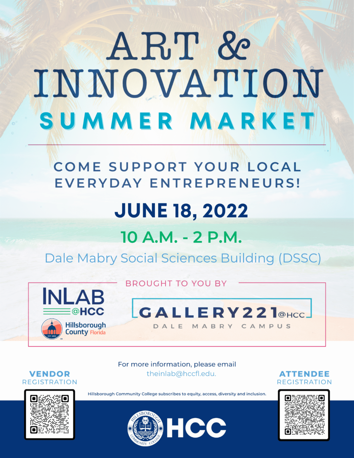Register today to attend the Art and Innovation Summer Market, a collaboration between the InLab@HCC and the Gallery221@HCC featuring HCC student businesses, artists, as well as community everyday entrepreneurial small businesses.