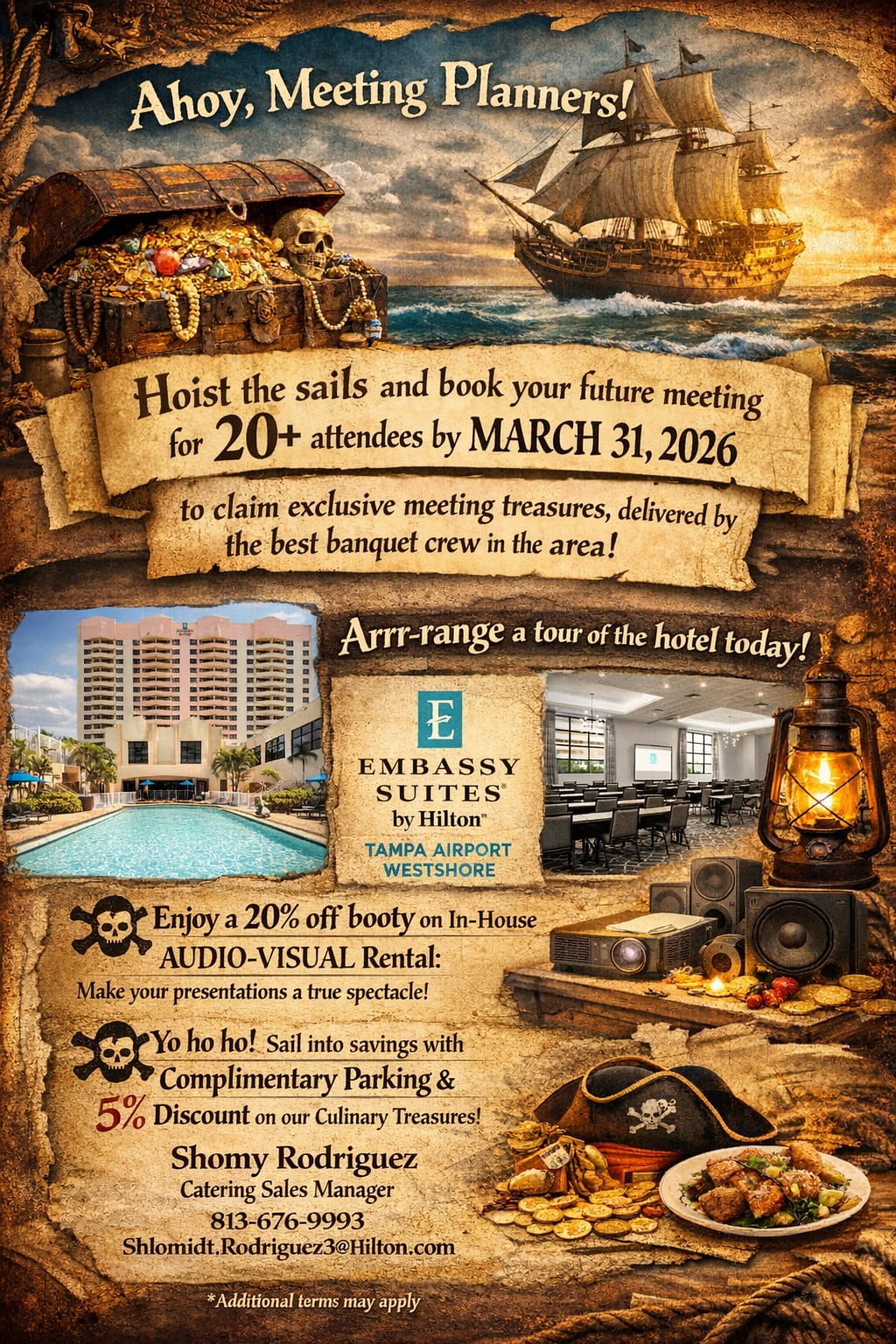 Book your next business meeting by March 31, 2026, and claim your Gasparilla treasures: free internet, AV, F&B discounts & waived parking—plus maybe some 3x Hilton Honors Meeting Planner Points hidden in the treasure chest! ⚓Additional terms may apply. Smooth sailing meetings start here—let’s chart your course!